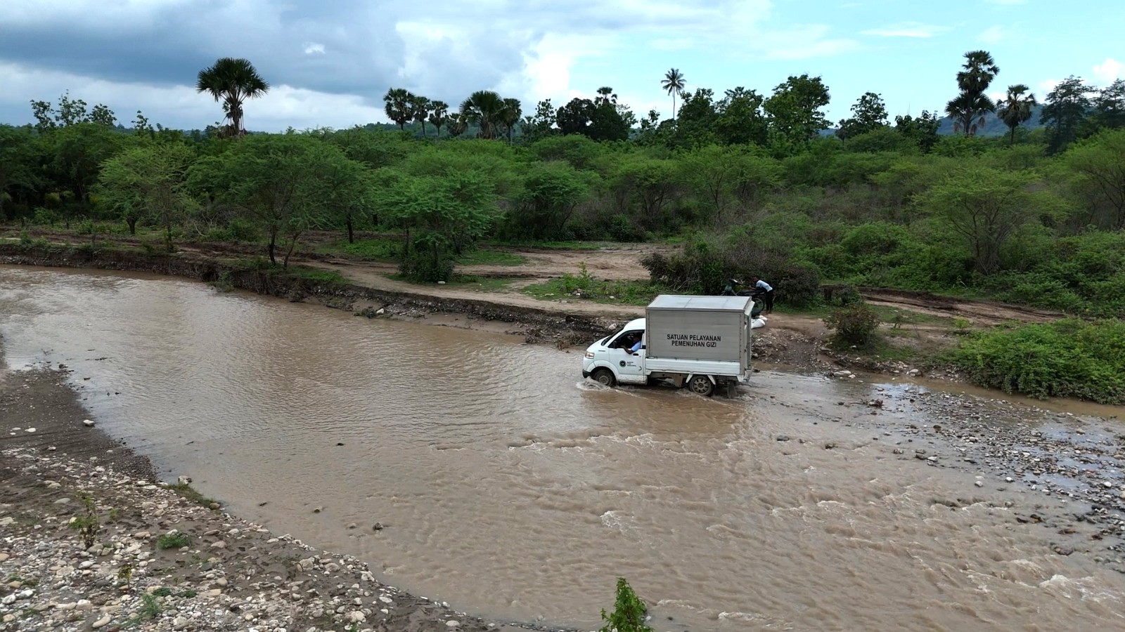 Paket MBG diantar dari dapur menggunakan mobil hingga bibir Sungai Noelmina. Selanjutnya, warga mengangkut paket-paket tersebut menyeberang sungai, lalu melanjutkan perjalanan menggunakan gerobak hingga tiba di sekolah-sekolah penerima manfaat.