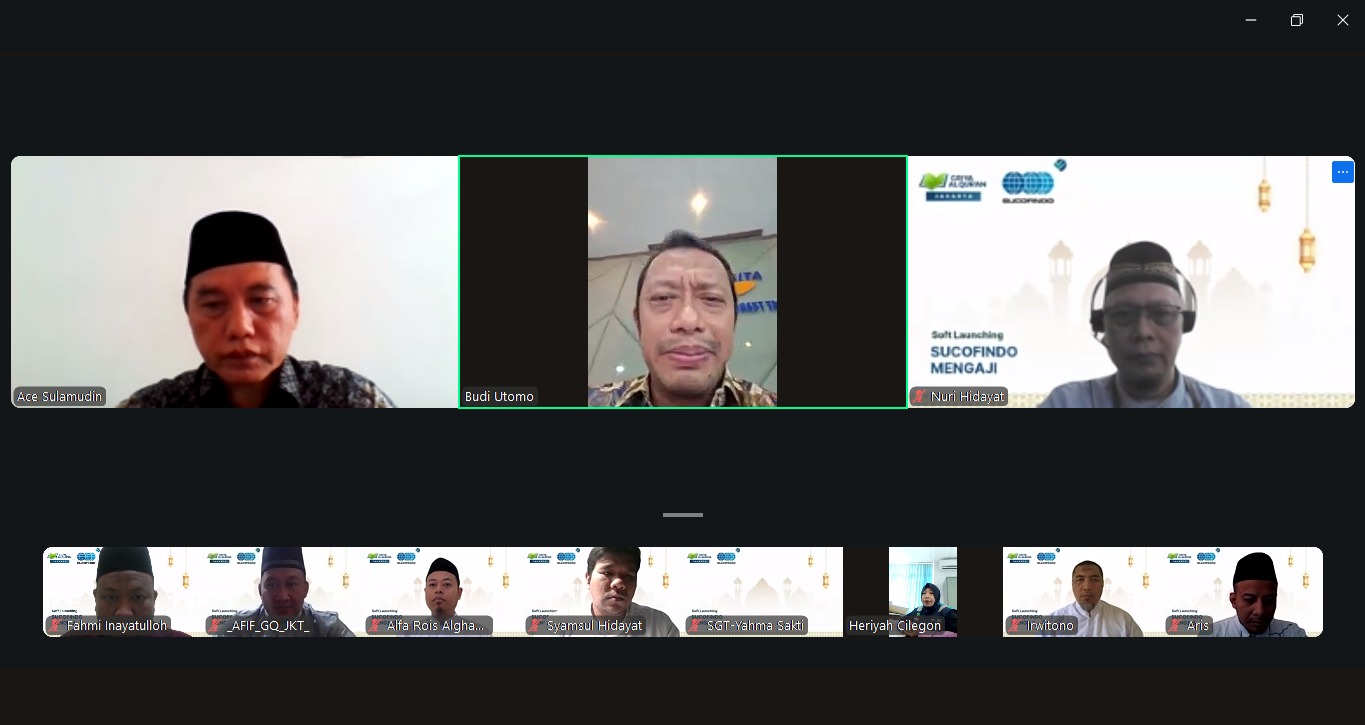 Turut bergabung secara daring Bapak Budi Utomo selaku Direktur Layanan Industri sekaligus Pembina Majelis Pengajian Sucofindo dan Bapak Irwitono selaku Ketua Yayasan Griya Al Qur’an.
