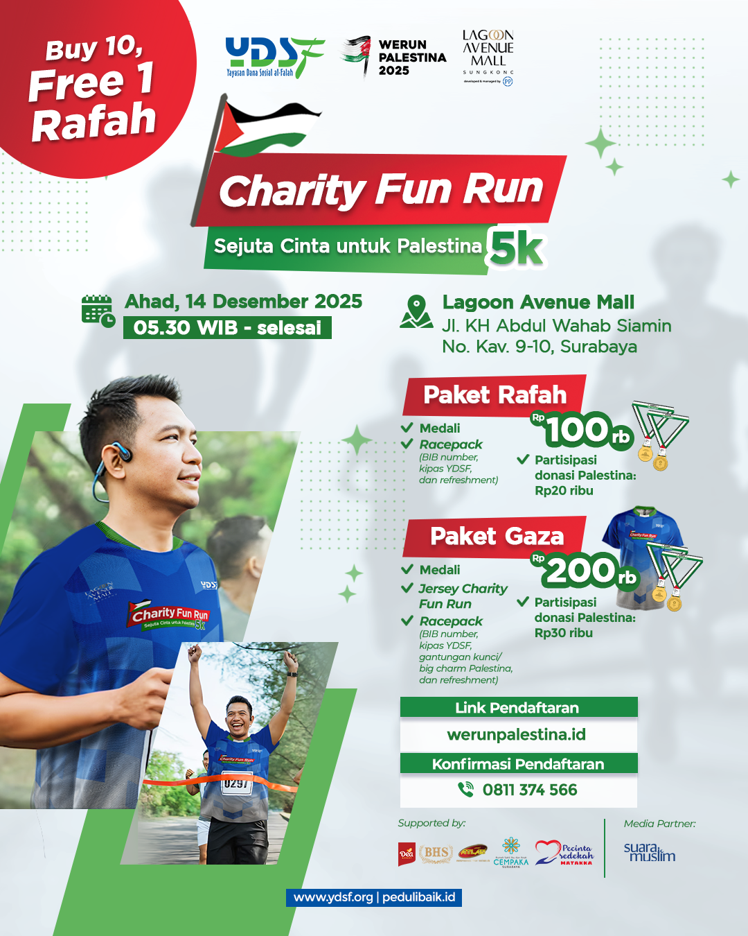 Rakyat Palestina masih terus berjuang melawan Zionis yang kejam. Mari, kita berikan doa dan dukungan terbaik untuk mereka. Salah satunya, dengan berpartisipasi dalam Charity Fun Run ‘Sejuta Cinta untuk Palestina’. Setiap langkah kita, begitu bermakna dalam membersamai perjuangan Palestina.
